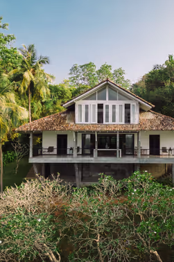 12 Suiten und Cottages verteilen sich auf dem hügeligen Dschungelgrundstück. Jede Unterkunft hat ihren eigenen Charakter und bietet ein Gefühl der Intimität mit der Natur, während sie gleichzeitig einen unvergleichlichen Blick auf den Koggala-See gewährt. 4 Tree Houses schmiegen sich sanft an den steilen Hang und bieten eine schwebende Aussicht, während die 3 Cottages die traditionelle Bauweise respektieren und mit modernen Designphilosophien kombinieren. Die 4 Garden Suites fügen sich kaskadenartig in die sanfte Landschaft ein, ein modernes und minimalistisches Statement, eingebettet in das Terrain. 1 Two-bedroom Villa über Yoga Escapes anfragbar.